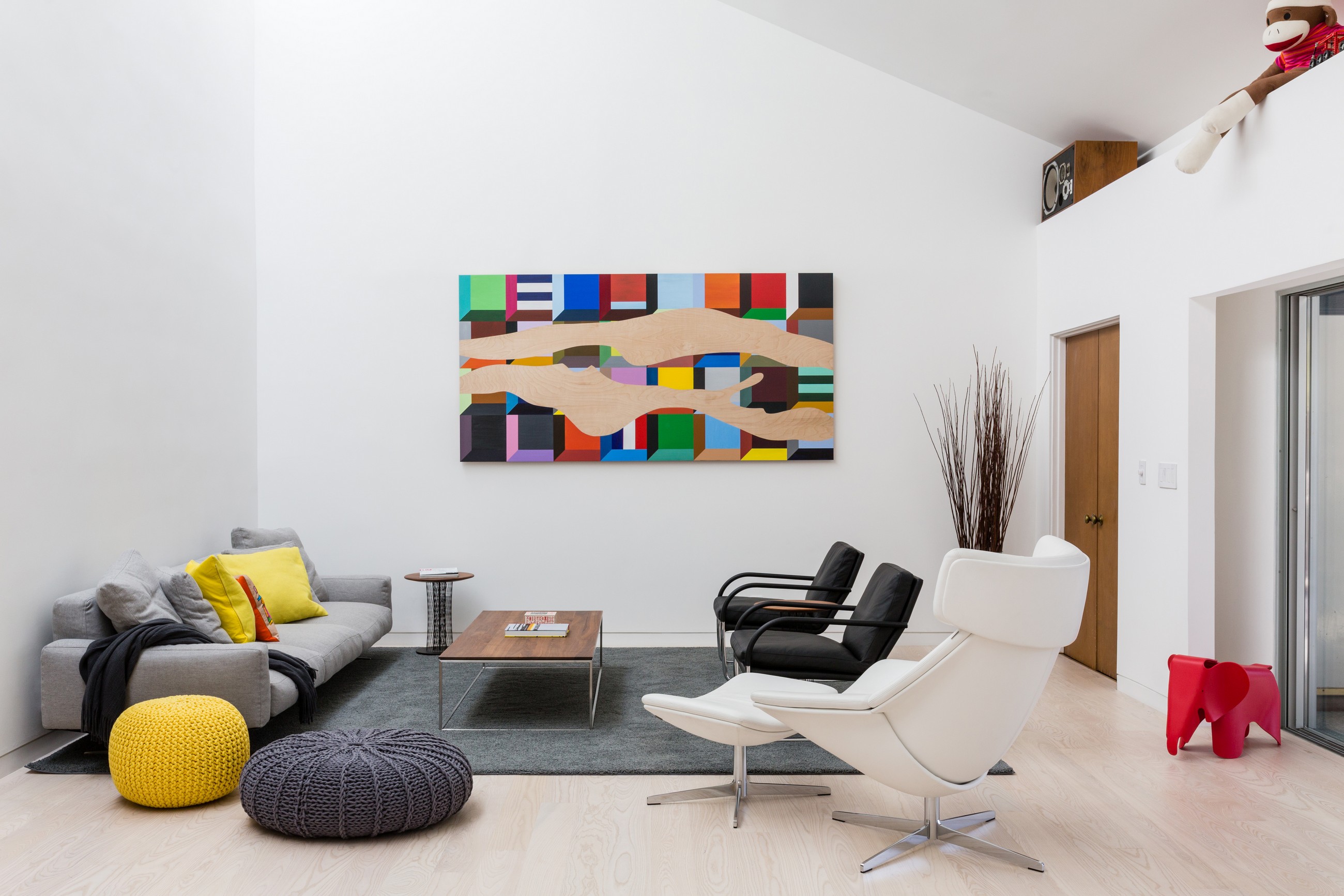A side table features a hand‐woven base with walnut wood surface to soften the hard lines within the space. Beside the sofa are two knit poufs—one yellow, one grey—for casual relaxation on the floor. Brunn constructed the vibrant‐colored wall art from a large sheet of maple‐wood veneer plywood painted with bold acrylic paints. It depicts the world’s flags meshed together with two ribbon patterns to symbolize global harmony.