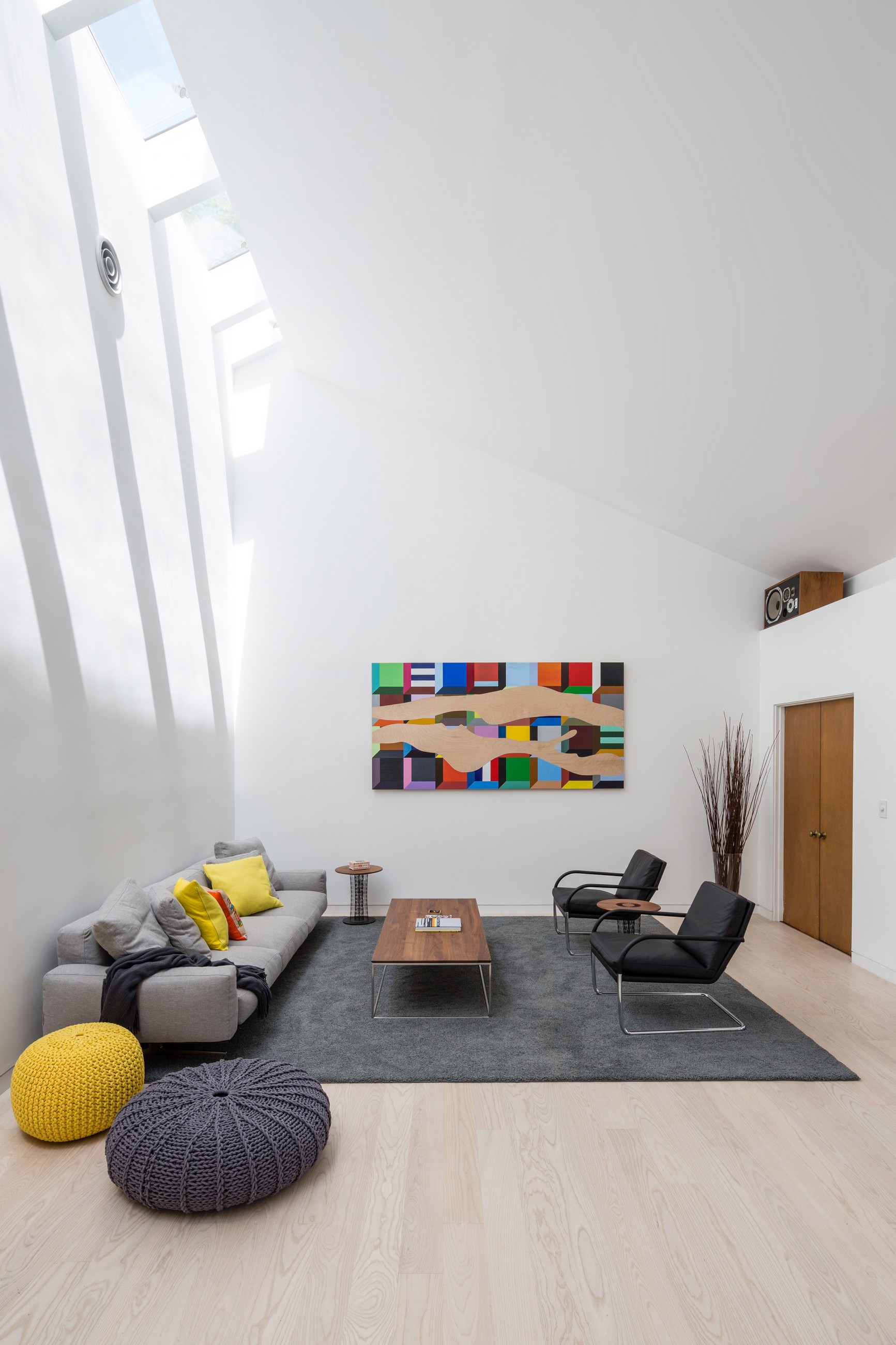 Several west‐facing skylights were installed against the crown of the roof’s ridge beam to further open the home. This design element brings the outdoors into the living and dining areas with bold rays of sunlight. When light enters the room, dramatic diagonal lines of rectangular shapes form on the wall to evoke natural art. The skylights flood the room with cascading sunlight and extra ventilation.