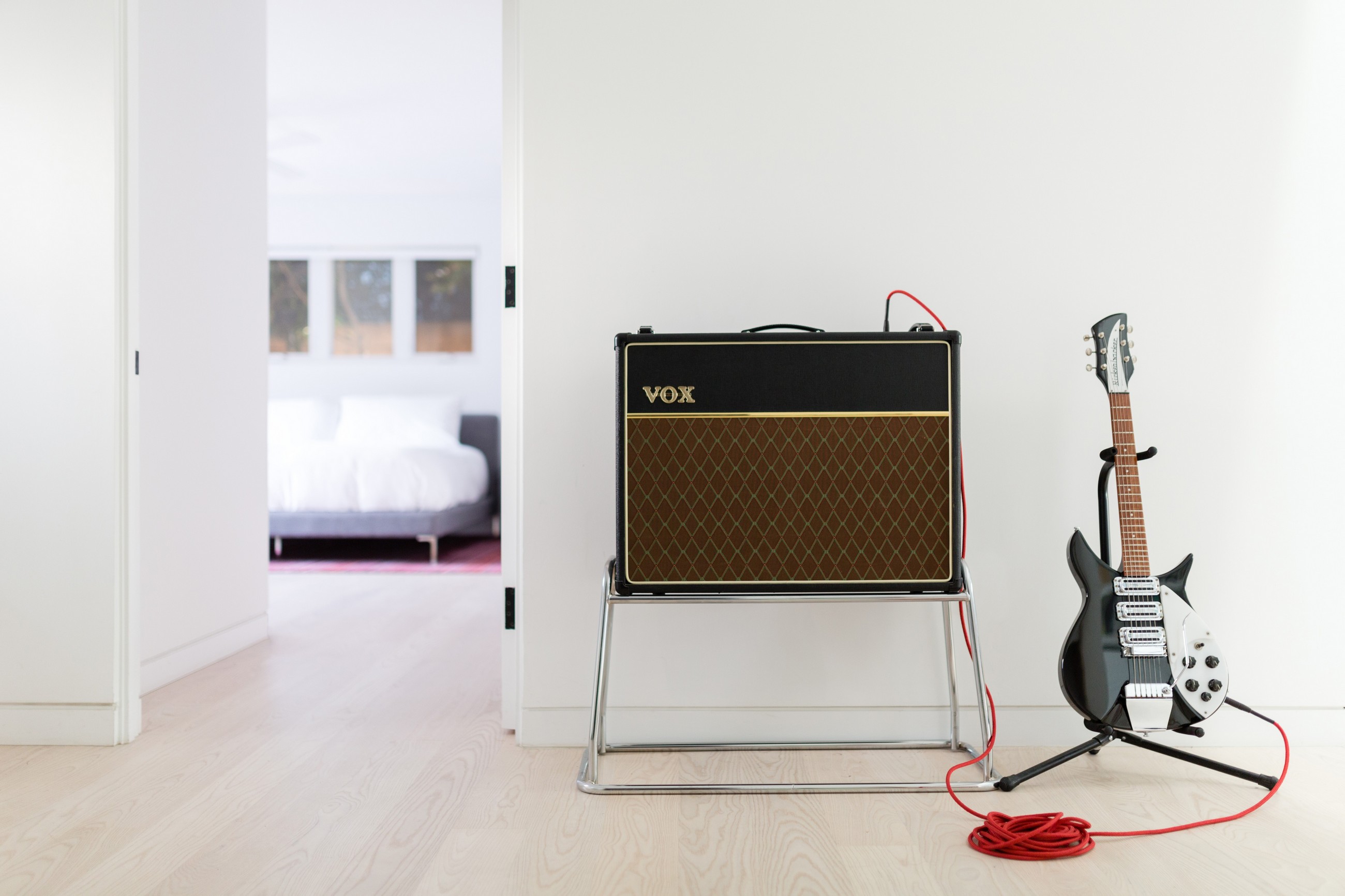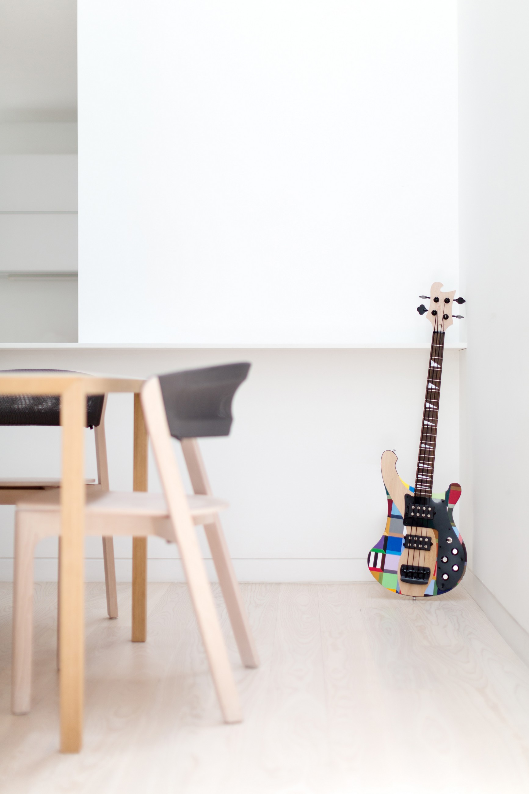 Directly across the living room is the dining area featuring a neutral color palette to maintain visual balance between spaces. The sleek, blonde‐wood dining table is topped with white DuPont Corian to allow easy cleaning. The blonde‐wood‐framed chairs include black, 3‐D knitted anthracite‐mesh backs to provide extreme comfort and stacking ability. Nestled in the corner is Brunn’s bass guitar that he adorned with the same flag patterns as the painting. The furniture in both the living and dining rooms is minimal, to keep the space open and uncluttered.