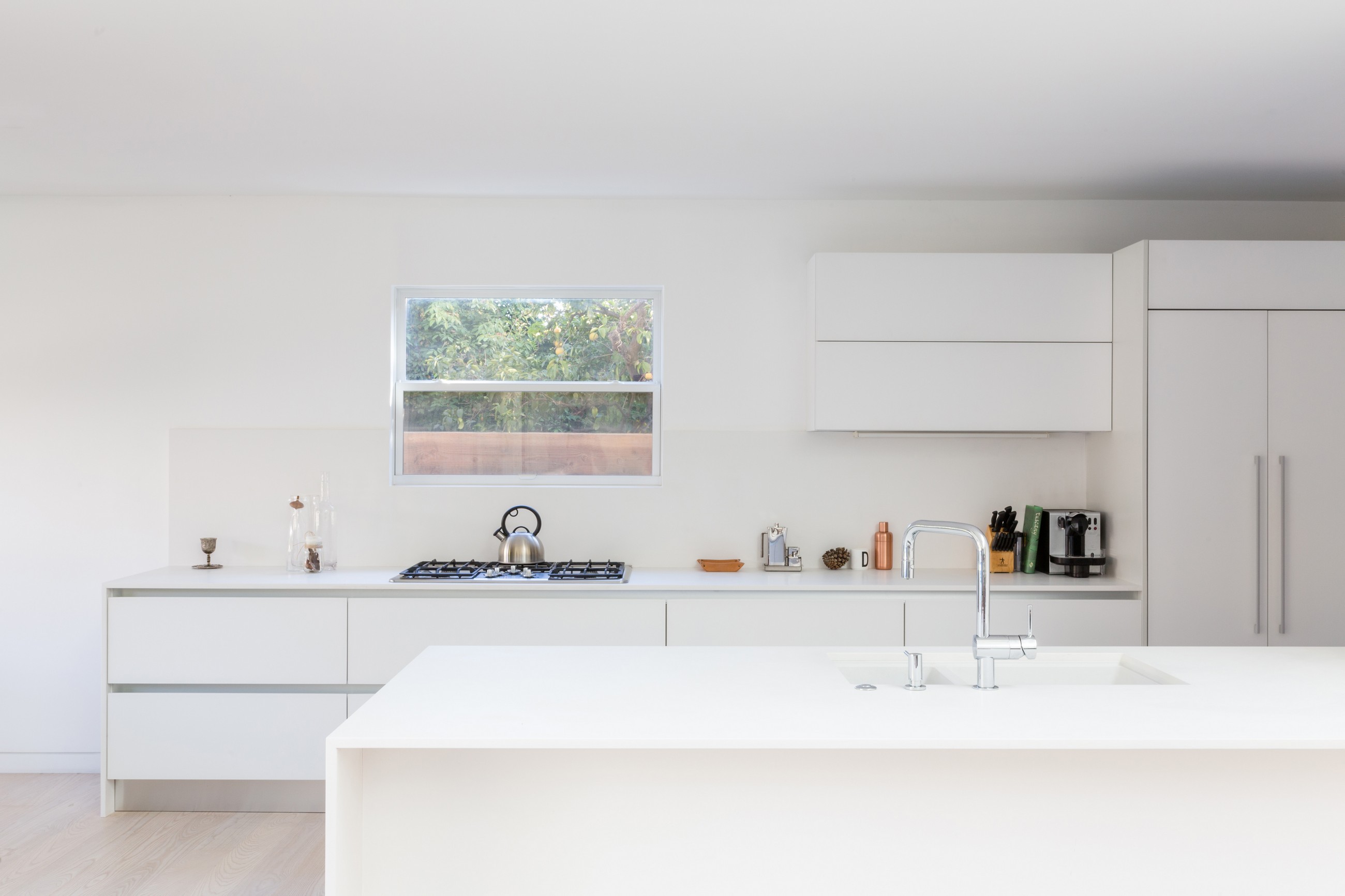 Above the kitchen and below the skylights sits an inviting loft space cleverly accessible with a hidden ladder that retracts into the laundry room. Serving as a private sanctuary, the loft is filled with design books, old records, and a vintage 1978 Pioneer Hi‐Fi stereo. The loft adds more height to the central living space, while remaining open to views below. Opening the ceiling necessitated the addition of a new wooden post, which the architect left as natural wood to add warmth and acknowledge the structural work done on the house. A thin glass railing, floating elegantly along the perimeter, encloses the loft while keeping the central living area visible. The ledge on the other side of the glass features the architect’s most prized possession—The Beatles “Can’t Buy Me Love” 1000% Kubrick Set. The large, cartoon‐like plastic and rubber figures of the Beatles—the architect/musician’s all‐time favorite band—adds a pop of color and whimsy.