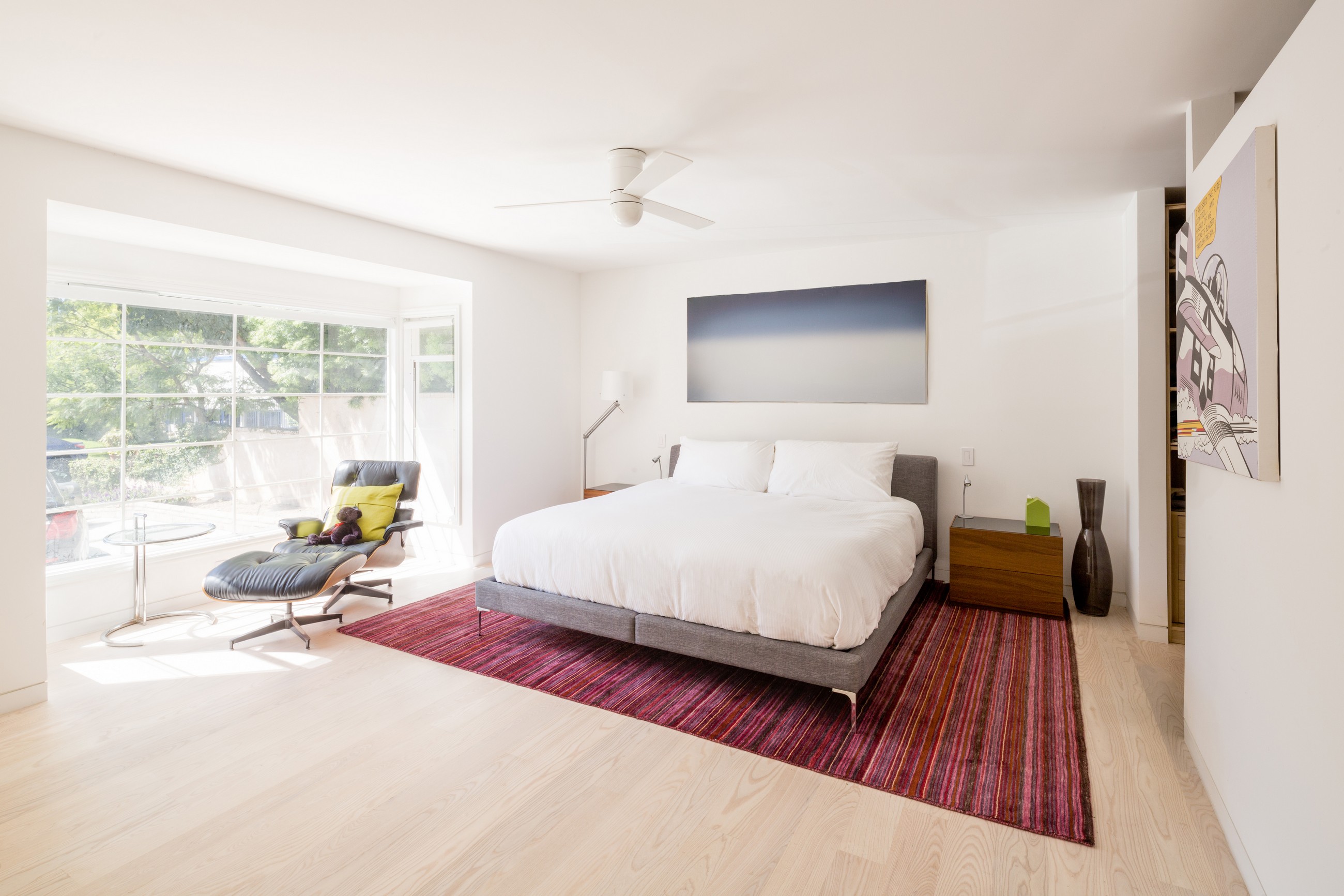 The vast, open spaces continue in the master bedroom. White and neutral tones manipulate the area, along with a magenta‐striped carpet and black Eames lounge chair to provide the only color accents. The master bathroom consists of large‐format porcelain tile, blond‐wood cabinets, and a glass‐encased shower—all following the architect’s notion of the beauty of simplicity. A clerestory window stretches along the full length of the basin wall. The backlit mirror sheds glowing light into the space.