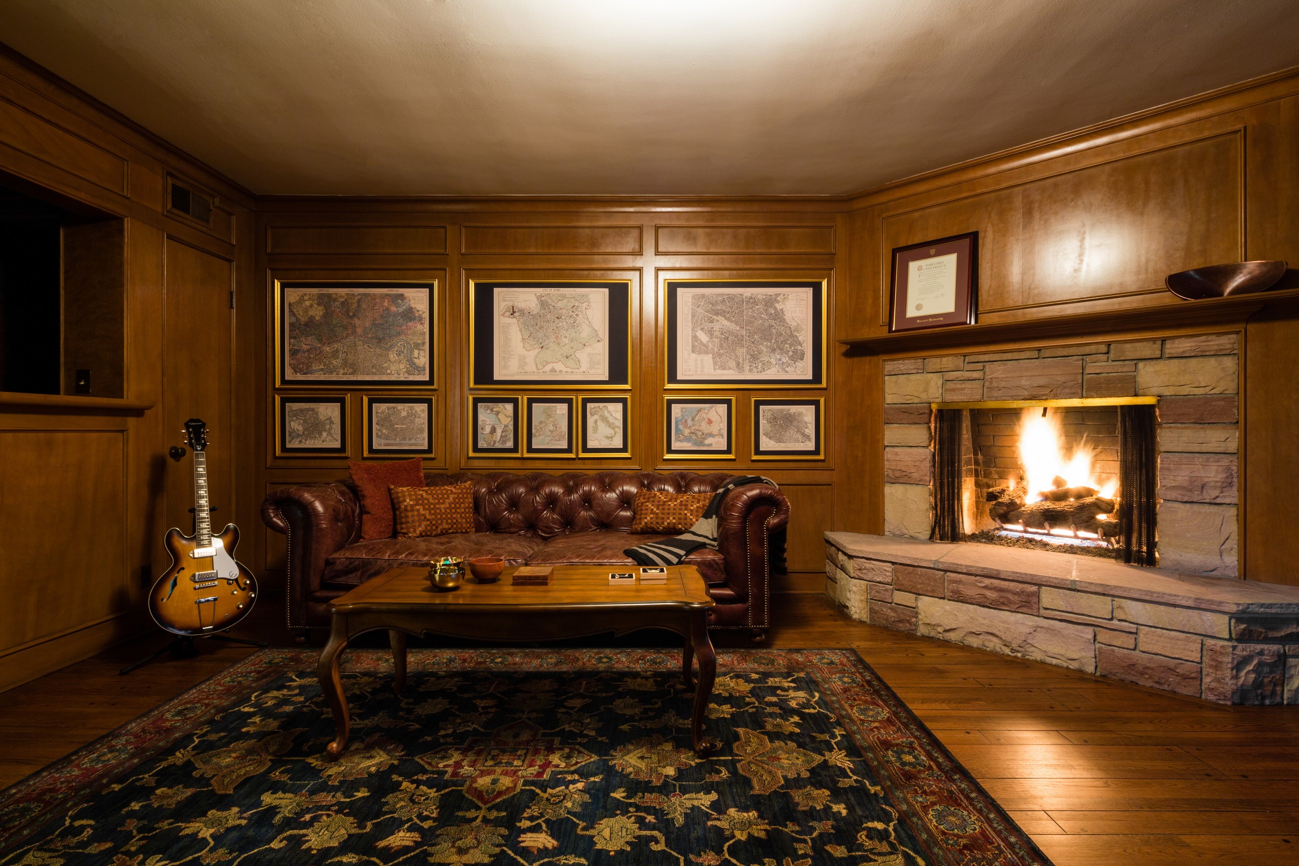 At the far corner of the house is the den serving as a bonus room. The room’s traditional style is original to the house and was left completely untouched. “I always wanted to have a homey‐ looking den like this, but it’s not in my DNA to design this way,” expressed Brunn. Floor‐to‐ ceiling wood paneling and flooring create a log cabin feeling, along with a stone fireplace for coziness. A dark‐brown leather Chesterfield sofa and oak coffee table express masculine sensibility. An oriental rug of burgundy, blue, and gold tones tie the room’s palette together. A series of gold‐framed maps and the architect’s bass guitar complete the décor. Although in complete contrast with the home’s minimalist aesthetic, the den serves as a quirky yet inviting gathering space for guests.