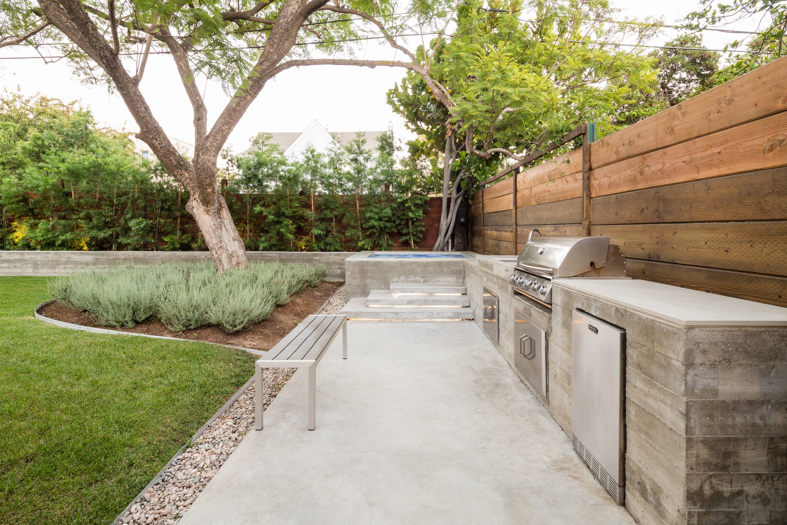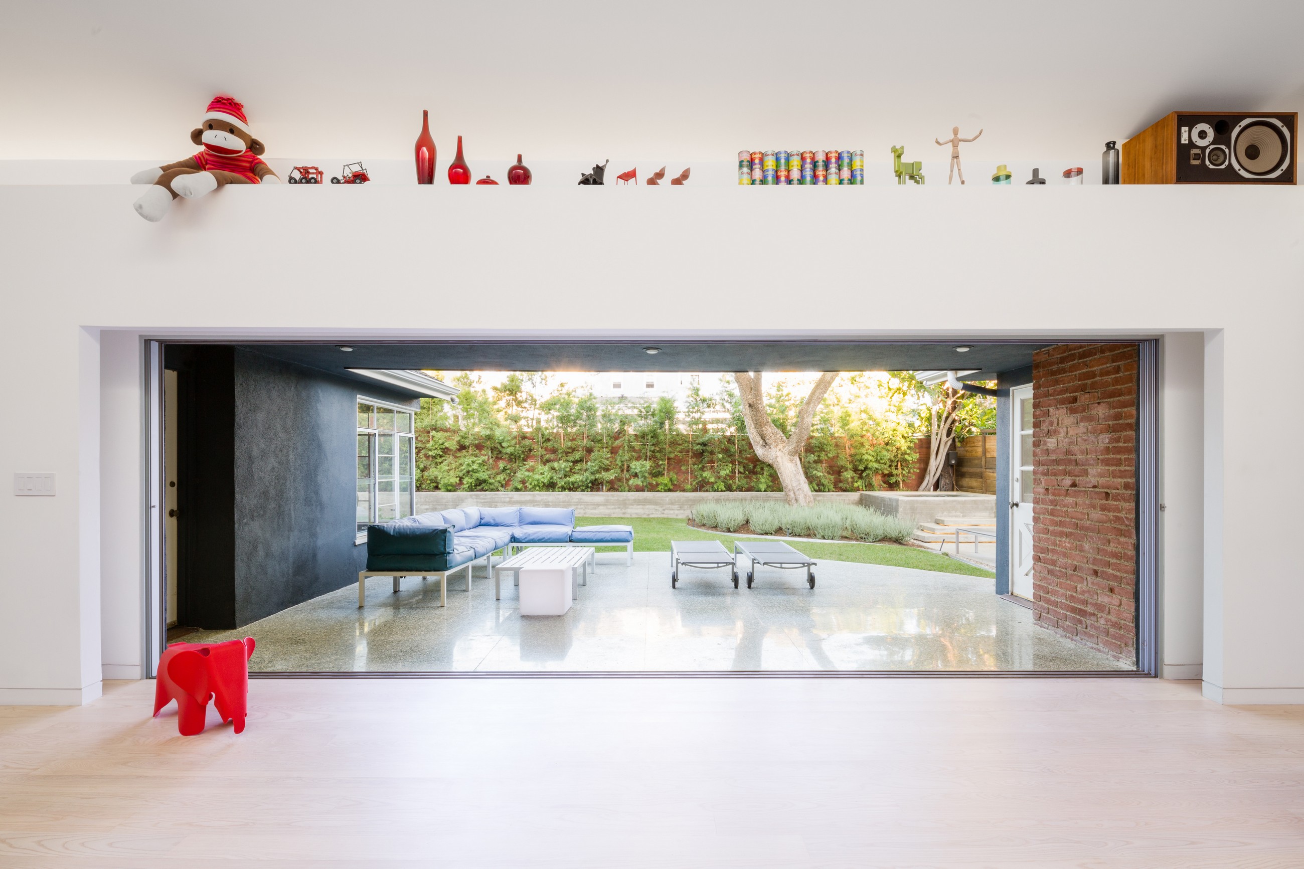 Retractable glass sliding doors from the home’s central space create a grand welcome into the backyard. The shelf above the doors is framed in order to store various design objects, while hiding the curtain track. A colorful, 20‐can series of limited‐edition Andy Warhol real cans of Campbell’s Tomato Soup curiously draws the eye upward. A covered patio includes a sofa, lounge chairs, and coffee table for outdoor enjoyment. The backyard becomes an open space used for entertainment and features a board‐formed concrete kitchen with barbecue and whirlpool spa.