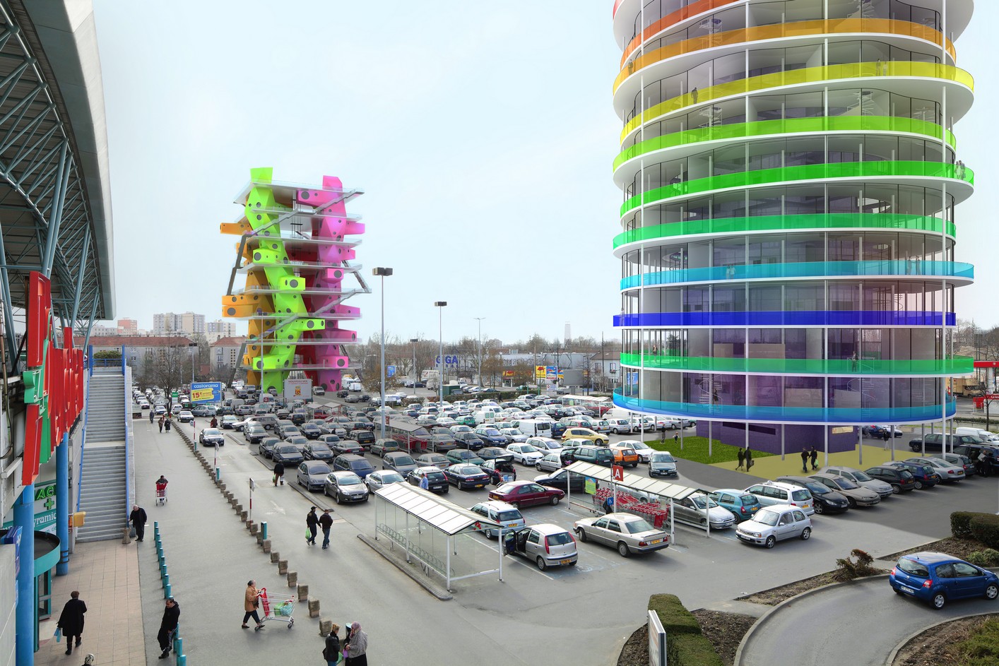 Architecture and urbanity can only come about through the advent of new schemes that restructure part of the vast commercial hangars into sports, cultural or multipurpose facilities, and the gradual transformation of the car parks into car gardens at the foot of the new housing towers. The "car garden" concept is the result of our thinking about the foreseeable evolution of the parking areas into shared surfaces, especially suited to shopping malls where occupation is rather unevenly spread over 24 hours or over a week.