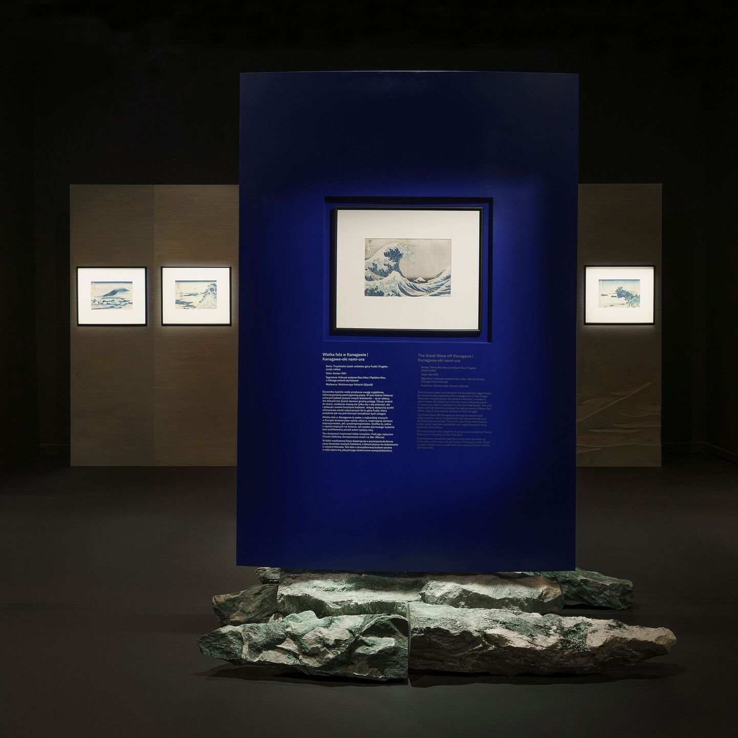 Also, smaller separating elements were designed individually. The wall with probably two of the most famous works by Hokusai ("The Great Wave off Kanagawa" and ”Fine Wind, Clear Morning”) stands on a specially selected boulder, which may suggest a reference to historical solutions in the shaping of Japanese gardens (keiseki stones) and architecture (soseki stones). The background for this free-standing display is a screen for selected works from the series "Thirty-Six Views of Mount Fuji".