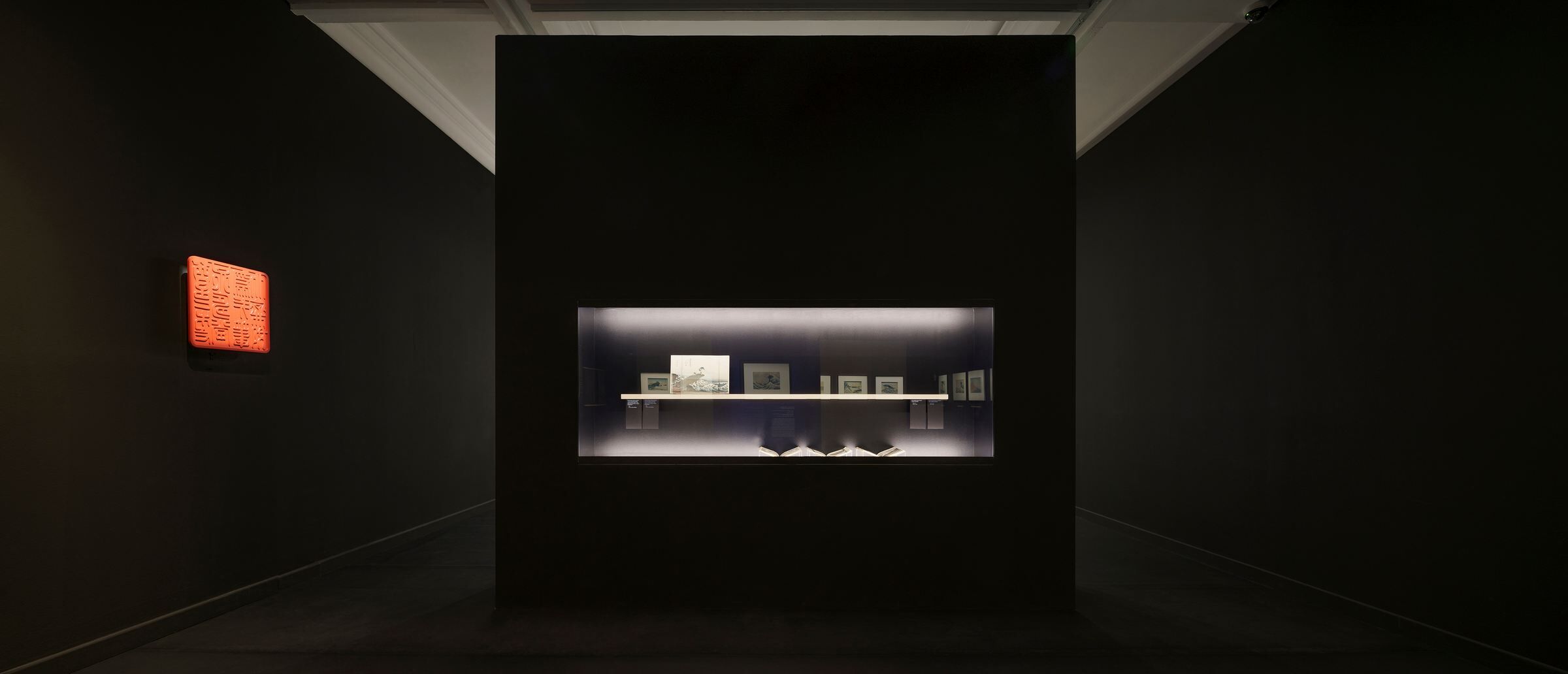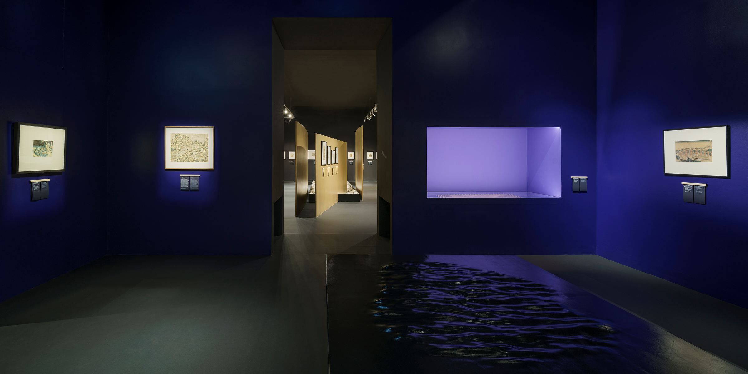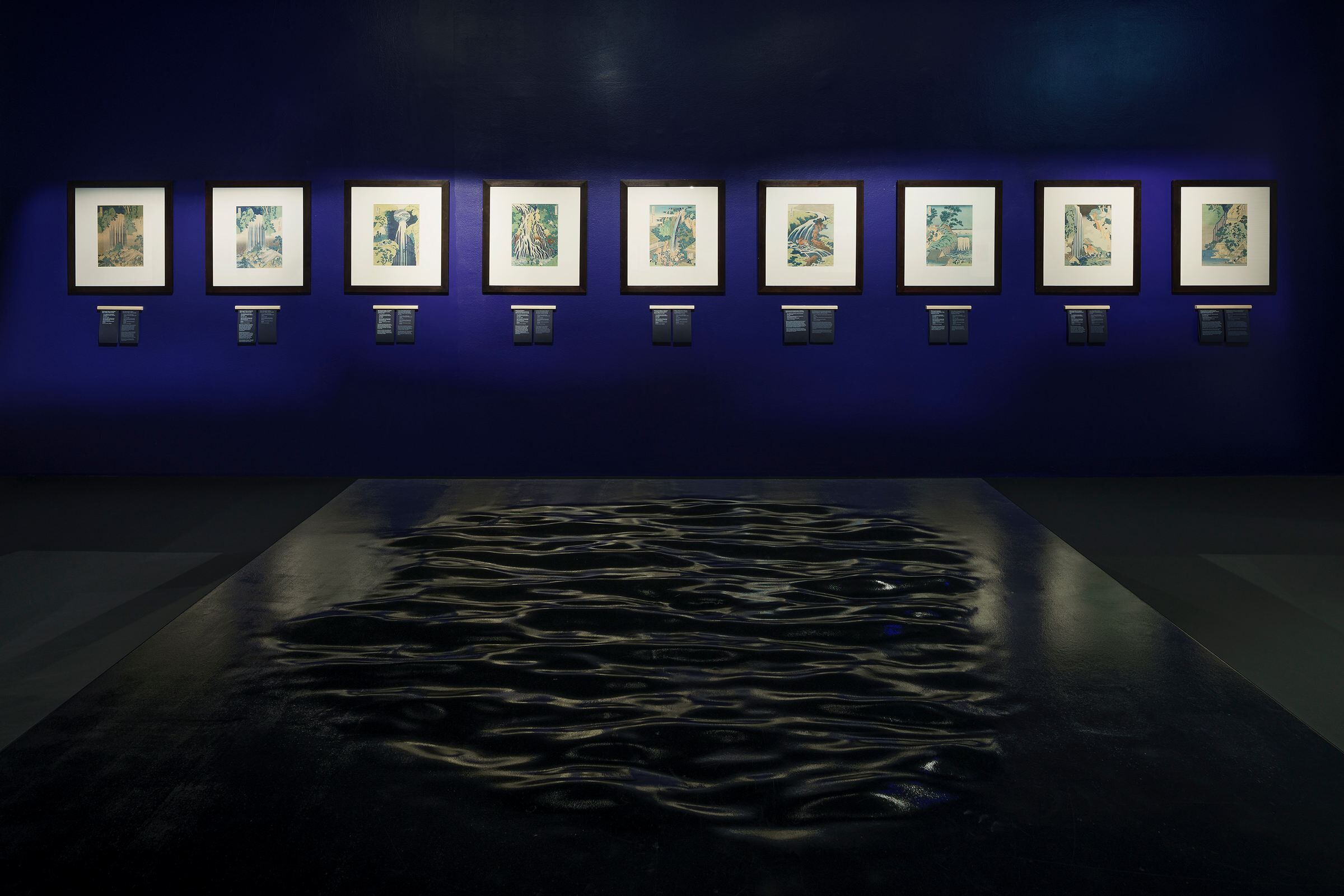 Elsewhere, the background for the exhibits are fire-treated wooden panels (yakisugi). Two reflective black walls, placed opposite in the first room, may in turn bring to mind the color and texture of Japanese lacquer used in traditional serving utensils. The dark colors and discreet lighting of the exhibition are a nod to the book „In Praise of Shadows" by Jun'ichirō Tanizaki. All rooms are painted black, with the exception of one central room with waterfall representations – in this case a satin navy blue color taken from the works of Katsushika Hokusai was applied.
