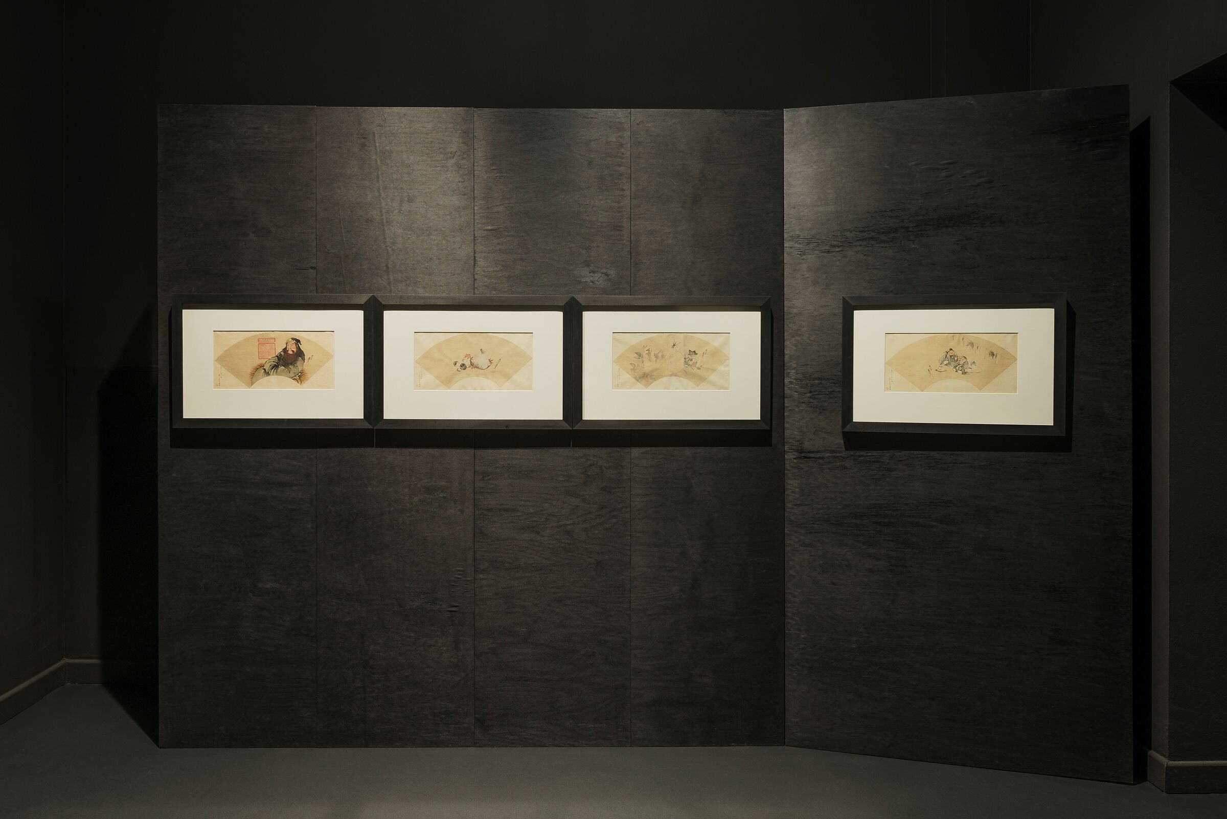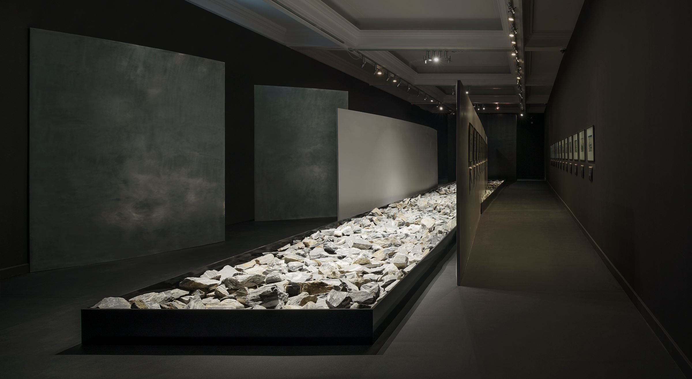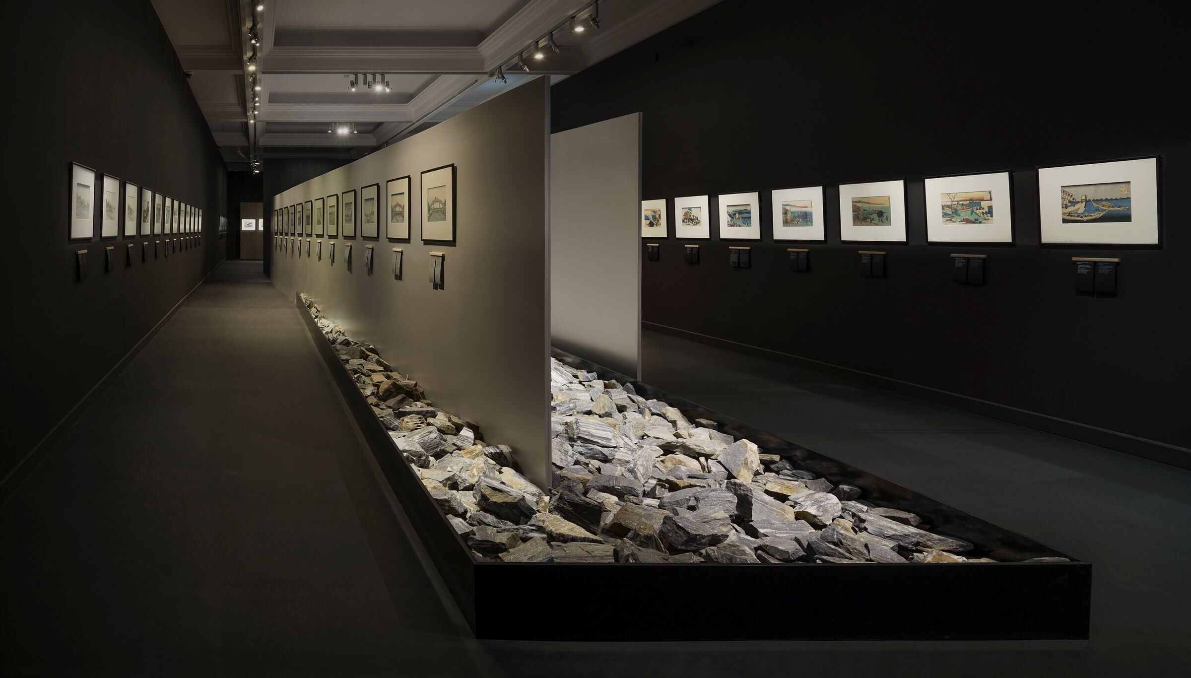Elsewhere, the background for the exhibits are fire-treated wooden panels (yakisugi). Two reflective black walls, placed opposite in the first room, may in turn bring to mind the color and texture of Japanese lacquer used in traditional serving utensils. The dark colors and discreet lighting of the exhibition are a nod to the book „In Praise of Shadows" by Jun'ichirō Tanizaki. All rooms are painted black, with the exception of one central room with waterfall representations – in this case a satin navy blue color taken from the works of Katsushika Hokusai was applied.