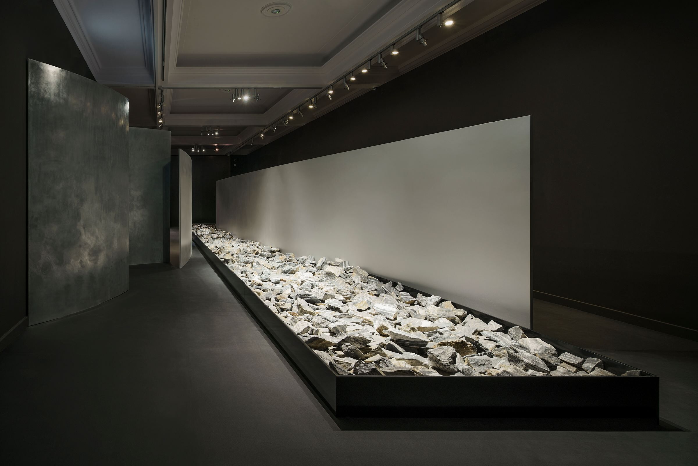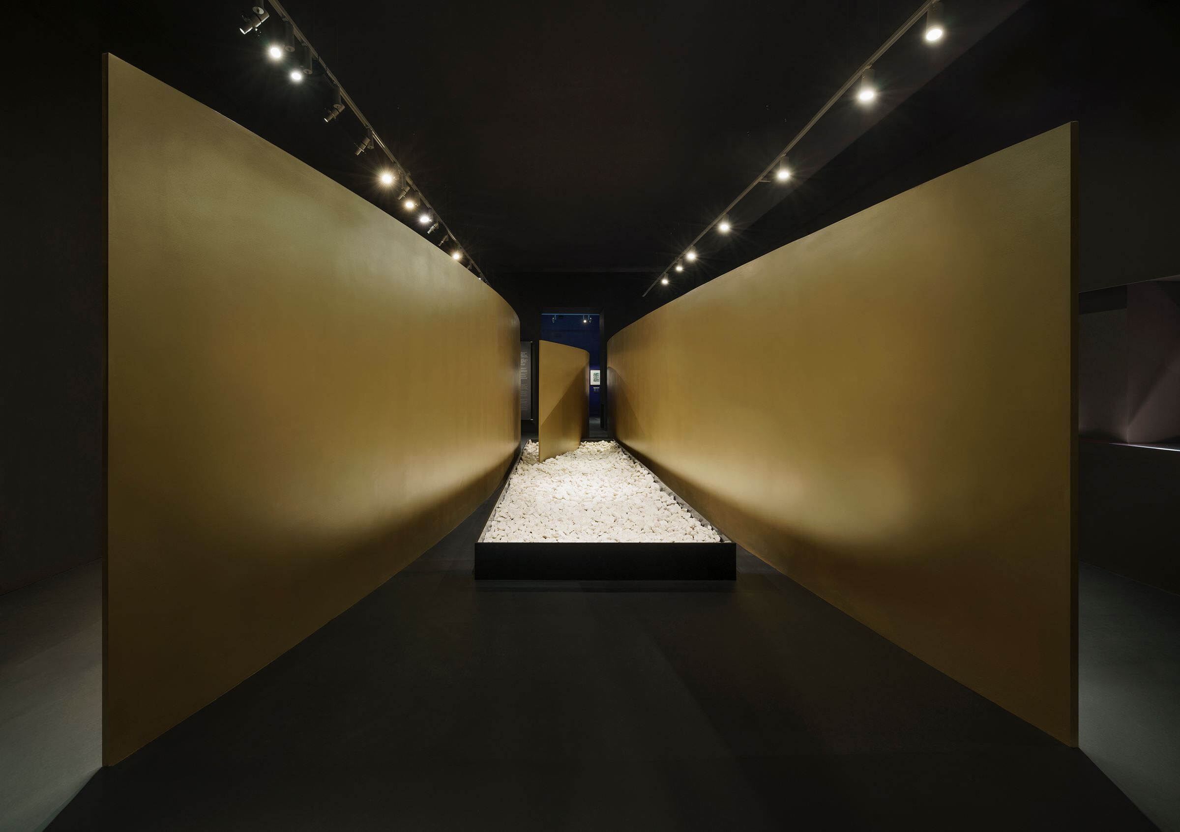 Such subdued, metallic hues are a reference to similar colors used in Japanese art (fuki bokashi – shading, silver plating and gilding in woodblock printing, maki-e – craft gold plating) and architecture (hishibuki – wiping off zinc sheets). Seven free-standing narrow walls (”slimmed” at the edges to a width of between 1 to 3 cm) disturb the regularity of the layout and symmetrical enfilade arrangement. Their plan may resemble calligraphic brush strokes or cuts in woodblocks.