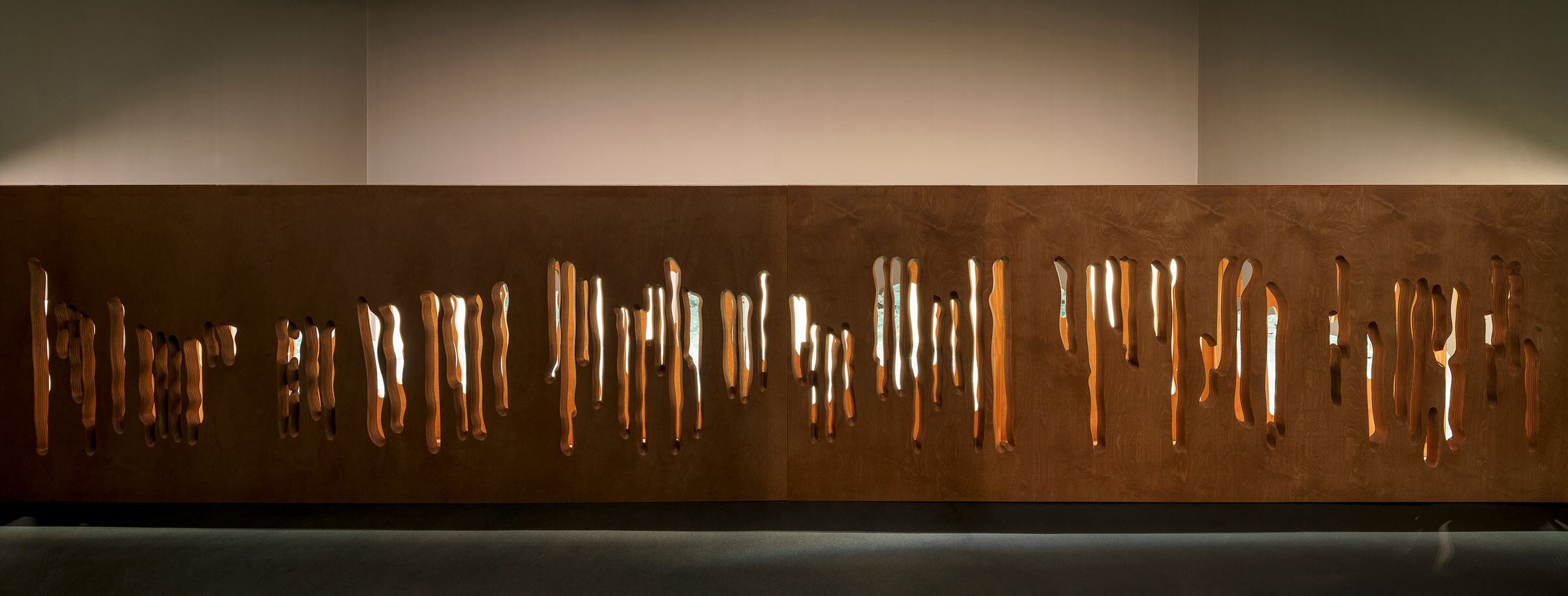 The panel boards, hand-dyed gray, are cut by an engraving which is an enlargement of a few lines from the "great wave" exposed in front of it. This gesture was intended to illustrate the woodblock carving technique on a larger scale and strengthen the relationship between the work of art and its background. Another work – ”The Dish Mansion" from the series "One Hundred Ghost Tales” – inspired the creation of a perforated balustrade in one of the smaller rooms. Patterns cut in tinted plywood are based on lines created by Hokusai illustrating wood divisions (this procedure may also resemble an architectural interpretation of the so-called blind embossing technique – karazuri).