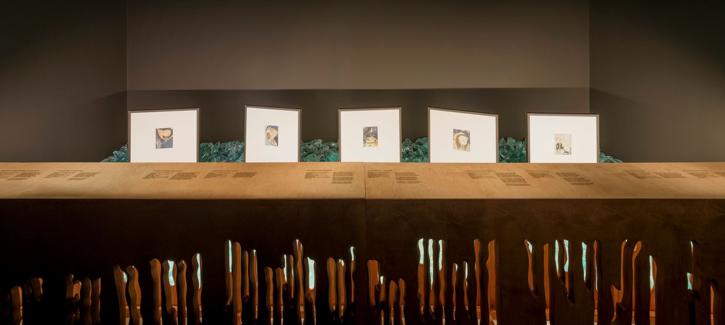 In subsequent exhibition spaces, the selection of colors and materials is also based on specific works by Hokusai. In the room with the representations of "ghosts and apparitions", free-standing frames with woodblock prints appear in a camouflaged „garden" filled with pieces of turquoise sintered glass. In turn, in the dark blue room with illustrations of waterfalls and bridges, a spatial installation inspired by the surface of water is placed in the central point. This attempt to capture something elusive in a permanent form fits in with the concept of ukiyo-e, describing old Japanese art as "images of the floating world". This idea is present in many elements of the exhibition arrangement, including the intangible ones – discreet music, moving projections, or the smell of various natural materials (wood, stone, canvas, paper).