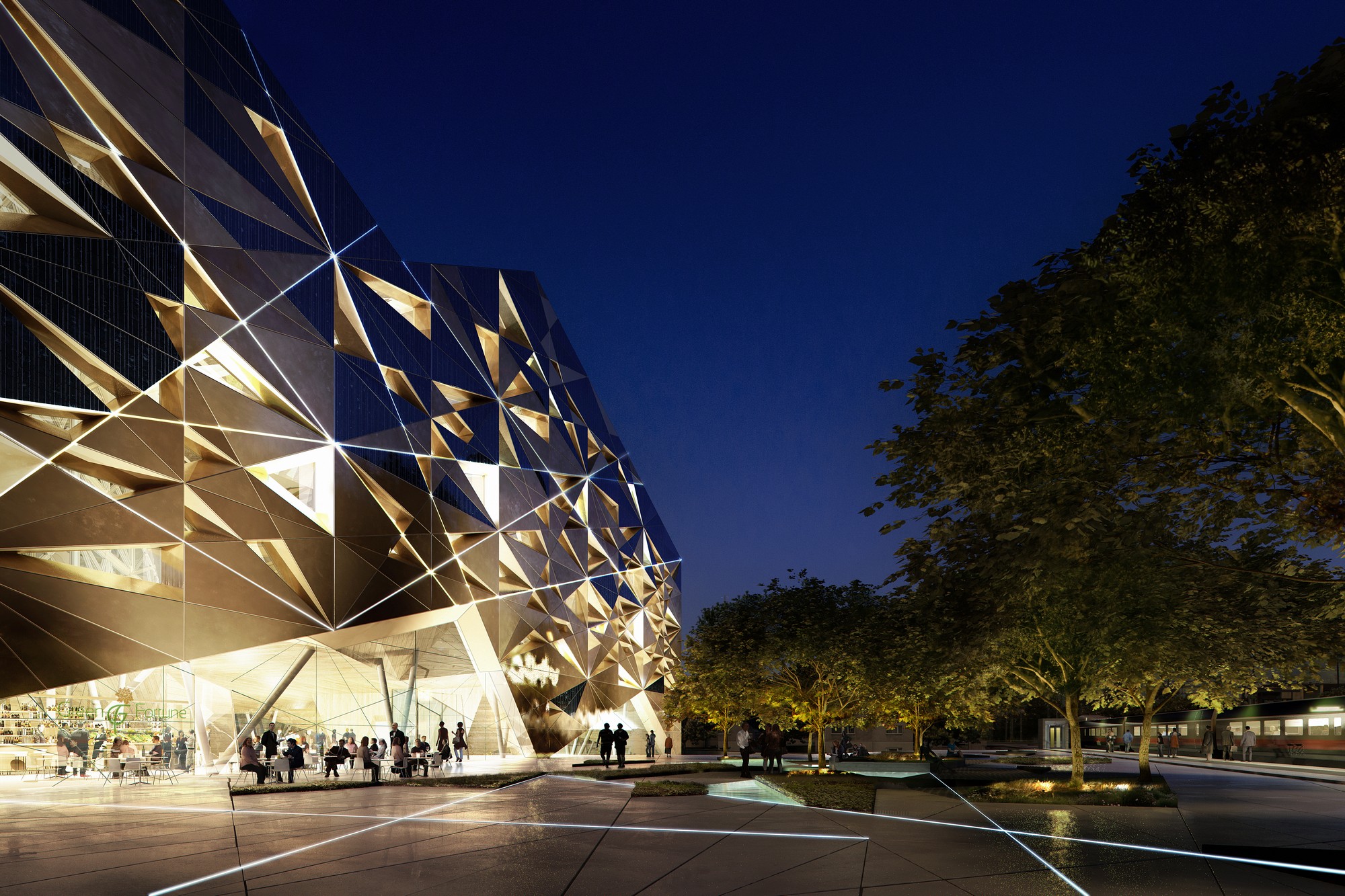 The building is based on a rational system with a concrete frame faced with metal coffers dividing the façade into a number of large rectangles, which in turn are traversed by differently inclined diagonals. The result is a complex pattern of triangles varying in both shape and size. Windows, solar cells or blank metal cladding units in various shades of golden yellow are then positioned inside the various triangles These irregular formations endow the façades with a beautiful, complex, varied and aesthetically well-integrated form which puts one in mind of the facets of a cut gemstone. The wealth of variety is further enhanced by the ratio between the numbers of blank surfaces windows and solar cells differing between the façades at the different points of the compass, to allow for differing sunlight conditions. The coffer depths too are varied according to the degree of sunshielding needed on each façade, ranging from about 60 cm on the southeast and southwest façades to about 15 cm on the north one. The recesses for sun-shielding are set diagonally in relation to windows and the blank portions of the façade, so as to further reinforce its faceting. The pulling back of the windows into the façade provides all the sun-shielding necessary, while at the same time giving the façade a more coherent aspect and obviating any need for external screening. This integrated sun-shielding also eliminates the risk of problems during winters with heavy snowfall. The varying colour of the metal, with warm shades of orange and noticeable joins, imparts a living, human, warm quality to the material, and impression reinforced by string lights integrated with the vertical, diagonal and horizontal lines of the façade.